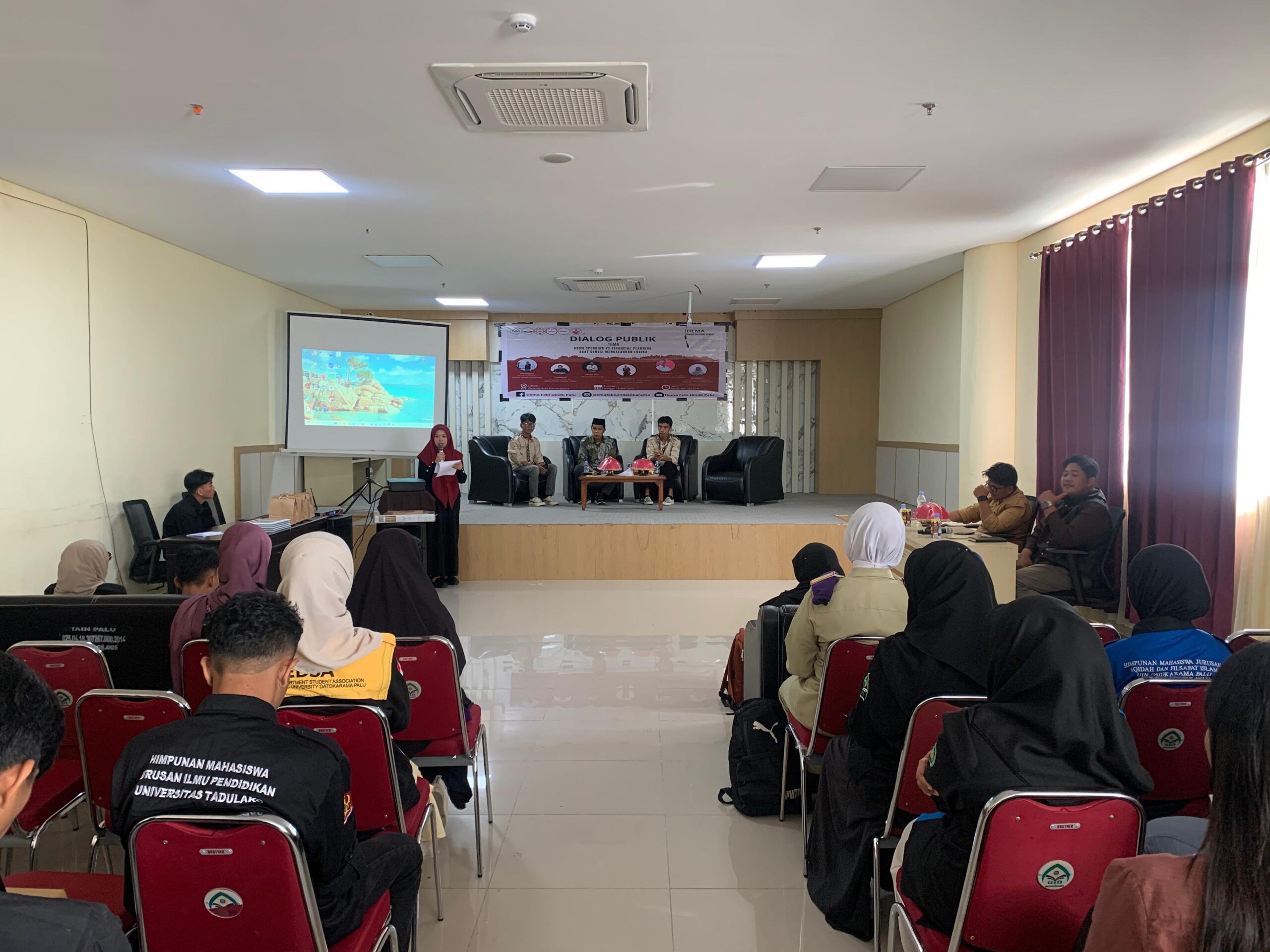 Dialog Publik ini diikuti oleh mahasiswa dari berbagai fakultas di UIN Datokarama Palu yang antusias menyimak materi seputar pengelolaan keuangan pribadi, gaya hidup konsumtif, serta tekanan sosial terhadap pengeluaran finansial generasi muda.
